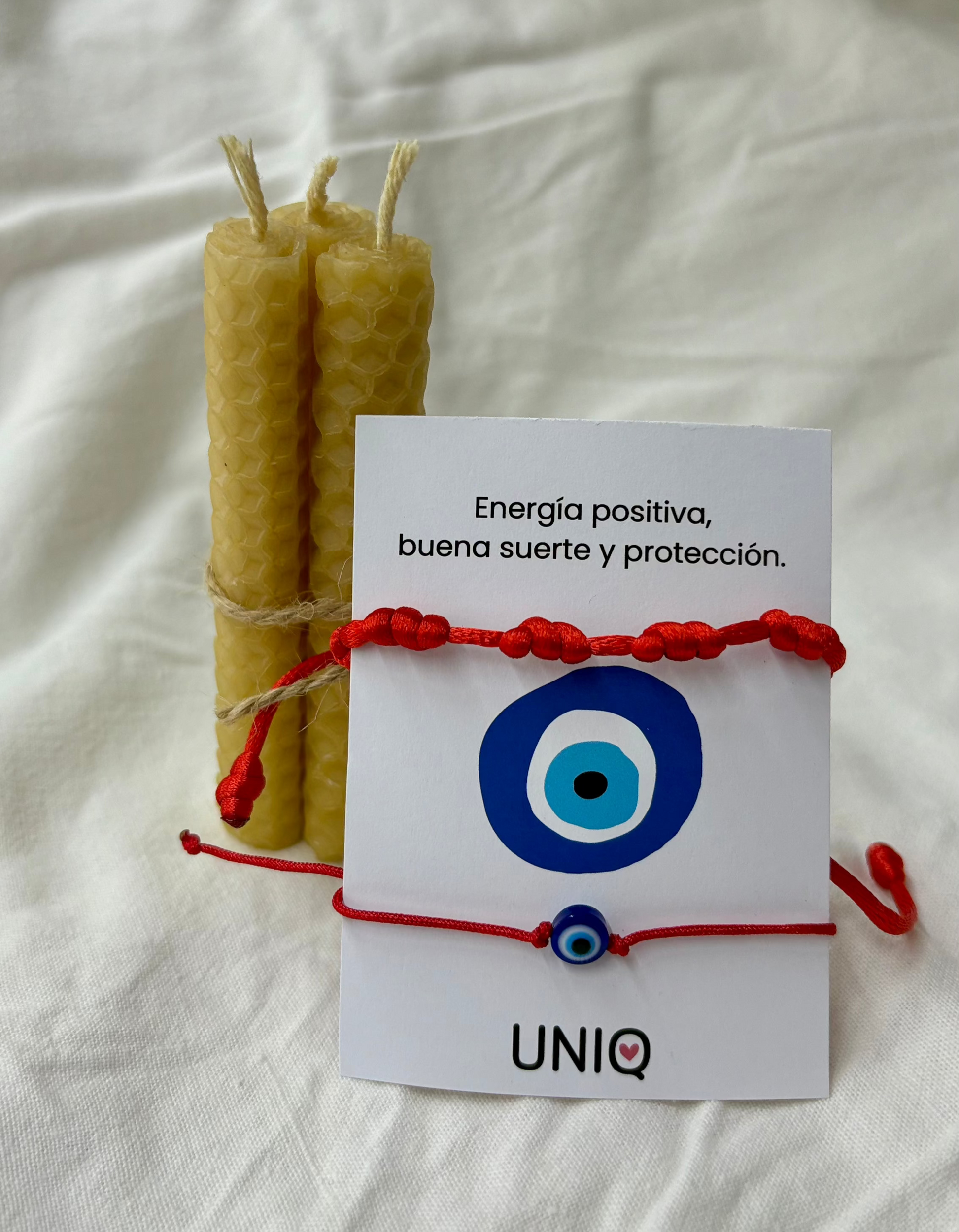 Llevate 3 velitas de miel para encender los 11 y 22 del mes, una pulsera 7 nudos y una pulsera de ojito turco.